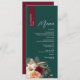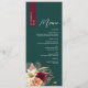 Ajoutez une élégance d'automne riche à votre paysage de table mariage avec ce menu mariage de bijoux personnalisé. Doté d'un arrière - plan vert émeraude profond et d'une spectaculaire bande bordeaux, ce design floral rustique présente des fleurs romantiques de couleur rouge, ivoire et vin aux herbes séchées, parfaites pour les fêtes d'automne ou d'hiver. Des polices élégantes et une disposition propre lui confèrent une atmosphère intemporelle et moderne. Customisez les détails du repas et le nom du client pour une alternative à la carte de place à votre réception.
