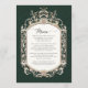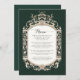 RICH EMERALD, VERT FORESTIER AVEC OR, MENU DE DÎNER FORMEL POUR RÉCEPTION DE MARIAGE OU FÊTE DES MARIÉES. Style classique et fabuleusement orné, aspect doré, cadre rococo baroque victorien sur un élégant motif damassé ton sur ton vintage en vert chasseur foncé qui a été dessiné graphiquement par Audrey Jeanne Roberts, artiste de renommée internationale ©