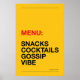 Égayez votre cuisine avec humour ! Affiche « MENU : EN-CAS, COCKTAILS, POTINS & AMBIANCE » en typographie moderne. Disponible en plusieurs couleurs de fond, parfait comme décoration pour la maison, cadeaux ou art mural pour la cuisine.