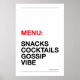 Illuminez votre cuisine avec humour ! Affiche « MENU : ENCAS, COCKTAILS, POTINS & AMBIANCE » en typographie moderne. Disponible en plusieurs couleurs de fond, parfait comme décoration intérieure, cadeaux ou art mural de cuisine.