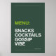 Égayez votre cuisine avec humour ! Affiche « MENU : ENCAS, COCKTAILS, POTINS & AMBIANCE » en typographie moderne. Disponible en plusieurs couleurs de fond, parfait comme décoration pour la maison, cadeaux ou art mural pour la cuisine.