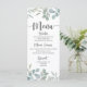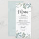 Vous adorerez cette belle aquarelle design élégante. Des éléments rustiques d'eucalyptus et de feuillage en vert sauge et bleu poussiéreux seront parfaits pour votre réception de mariage. Facile à customiser avec votre propre menu unique.
