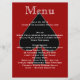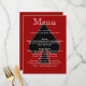 Menu orienté de réception de mariage de carte de jeu d'amusement. Les graphiques d'un grand symbole noir de pelles décore l'arrière - plan rouge foncé, avec le texte blanc fait sur commande prêt à personnaliser pour votre mariage. Menu lunatique de mariage grand pour Alice au pays des merveilles, le thème de jeu, et les mariages de Vegas aussi.