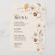 Les cartes de menu de mariage sont caractérisées par un style boho, des illustrations florales et des couleurs beige, avec un mélange de différents styles de police, souvent de différentes tailles, pour créer un look unique et éclectique qui rend l'esthétique naturelle de ce menu.