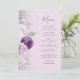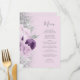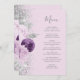 Cet élégant menu mariage moderne présente un design floral violet et lavande orné d'une parties scintillant en faux argent. Le texte personnalisable combine un script d'écriture manuscrite grise et une police de cuivre sur un arrière - plan lavande. L'envers reprend le design floral.