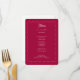 Cette carte de menu d'inspiration rétro et audacieuse, aux formes arrondies, présente un cadre à vague, une police de script et votre menu de dîner ou de mariage sur un arrière - plan fuchsia rose gras. Parfait pour un mariage moderne ou tout autre événement élégant. À l'arrière, vous avez la place pour vos noms et la date du mariage - ou simplement supprimer le texte au verso. Toutes les couleurs de cette carte de menu mariage - arrière - plan, texte et couleur de cadre d'onde - peuvent être modifiées dans l'outil de conception. Cette carte de menu magenta mariage fait partie d'une collection de mariages avec plus d'éléments correspondants.