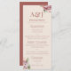 Ce menu de mariage élégant présente un thème floral élégant. Deux exemples d'initiales de monogramme sont imprimés dans la partie supérieure. Vous pouvez personnaliser le menu pour inclure vos propres initiales et options de plats personnalisés. Un délicat bouquet de fleurs d'hydrangea à l'aquarelle est imprimé en haut à droite, et un autre en bas à gauche. Les hydrangeas sont d'un rose romantique et rosé.