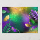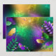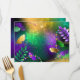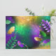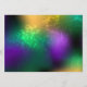 Arrière - plan textural iridescente mardi gras aux taches de violet, jaune et vert, décoré de plumes moelleuses et perles brillantes. Fête de Mardi gras.