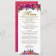 Ce menu combiné repas et bar ajoutera une touche de couleur vive à votre réception de mariage. Le jardin tropical comprend des fleurs d'hibiscus roses chaudes, des feuilles de monstères vert jade et une variété d'autres feuillages. Le titre du script d'or ajoute une touche de classe. Le menu est entièrement personnalisable avec le nom du couple et la date du mariage. Le menu Repas/Nourriture est à l'avant et le menu Boissons/Bar à l'arrière.