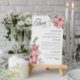 Menu mariage à fleurs roses avec un joli script, polices élégantes, fleurs roses et verdure.