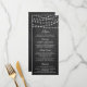 Simple mais élégant, les lampes à cordes de la collection de mariage de tableau noir est un design étonnant avec de belles lumières à cordes blanches suspendues sur un arrière - plan à effet de tableau noir, qui est parfait pour toute célébration mariage moderne. Ces cartes de menu peuvent être personnalisées pour votre occasion spéciale et feraient le menu parfait pour votre mariage, douche nuptiale, fête de fiançailles, fête d'anniversaire et bien d'autres occasions spéciales. Ajoutez votre libellé personnalisé à cette conception à l'aide des cases "Modifier ce modèle de conception" situées à droite de l'élément, ou cliquez sur le bouton bleu "Customiser" pour arranger le texte, modifier les polices et les couleurs et ajouter des informations ou des images supplémentaires à cette conception.
