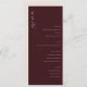 This elegant wedding menu features a sophisticated maroon background with an understated, cursive "menu" script at the top, exuding timeless charm and refinement. The layout is clean and modern, listing starters, salad, main course, and dessert options in a simple yet stylish font that complements the overall design. Perfect for a classic or formal wedding celebration, this menu conveys a sense of warmth and sophistication, ensuring your special day feels both memorable and tastefully curated. Customize it to reflect your unique culinary choices and create a cohesive dining experience for your guests.