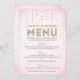 Cette charmante carte de menu conçue par The Spotted Olive ™ présente un joli fond rose clair avec une image de pierres précieuses scintillantes descendant du haut et le mot "Menu" typographié de manière élégante avec une image de paillettes dorées. VEUILLEZ NOTER : CE DESIGN NE COMPREND QU'UNE IMAGE IMPRIMÉE DE PAILLETTES ; IL N'Y A AUCUNE PAILLETTE PHYSIQUE UTILISÉE OU INCLUSE ; IL N'Y A AUCUN EMBELLISSEMENT.
