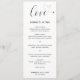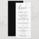 Menu mariage mignon avec un design simple et minimal avec le mot "amour" dans une élégante typographie avec un coeur à la fin. Ci-dessous, votre menu dans un sans serif moderne avec vos noms et votre date. Ces menus mariage de style minimaliste sont une excellente façon d'ajouter un élément de style et de formalité à votre journée spéciale.