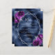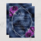 Cette élégante carte mariage moderne présente un cadre géométrique argenté décoré de bouquets de prune violet et de fleurs argentées sur un arrière - plan bleu marine en imitation feuille. Le texte personnalisable combine écriture fantaisie gris argenté, cuivre et polices italiques.