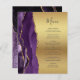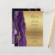 Le bord gauche de cet élégant menu mariage moderne est orné d'une bordure d'aquarelle violette ornée d'une fausse parties scintillant dorée. Le texte personnalisable combine un script d'écriture manuscrite gris charbon et des polices de cuivre sur un arrière - plan de fausse feuille or glam. L'envers est assorti d'une agate violette et dorée.