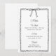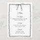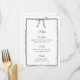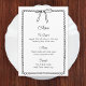 Ajoutez une touche de charme à votre événement avec cette carte de menu à nœud noir et blanc. Caractérisée par une illustration de nœud dessinée à la main et un cadre festonné pour une sensation ludique et élégante. Idéal pour les mariages, les fêtes prénuptiales ou les soirées de fiançailles avec une ambiance chic minimaliste. Le texte personnalisable facilite la coordination avec votre thème. Fonctionne magnifiquement avec une décoration monochrome ou inspirée de la France.