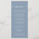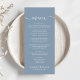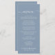 Menu bleu poussiéreux moderne pour votre réception de mariage, fête de fiançailles, dîner de répétition et autres célébrations mariages avec "menu" dans un script de calligraphie blanc chic avec des swashes, votre menu customisé dans une simple typographie blanche, vos prénoms unis par un coeur et votre date de l'événement.