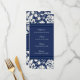 Elégant menu de dîner de mariage en bleu marine foncé et crème blanc classique motif damassé floral, personnalisable avec vos détails de dîner, disponible dans une large gamme de produits mariages assortis.