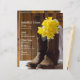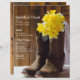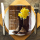 Personnalisez le menu de Mariage de la grange de canot de campagne décontractée mais classe avec les détails du repas que vous pourrez servir à votre déjeuner de douche à thème du ranch occidental de mars, avril ou mai, à la réception du mariage ou à la répétition du mariage. Personnalisez-le avec les noms de la mariée et du marié, l'emplacement du lieu et la date ou le texte et la police de votre choix. Ce charmant menu personnalisé comprend une photo florale pittoresque de fleurs de narcisse jaune, des bottes de cowboy en cuir marron, un voile de mariée blanche et du bois de grange patiné.