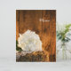 Customisez le charmant menu blanc Hydrangea and Barn Wood Mariage campagnard avec les détails du repas que vous pourrez servir à votre douche nuptiale d'été ou d'automne à la ferme, brunch post-mariage ou dîner de réception en ajoutant la salade ou le premier plat, entrée ou deuxième plat et dessert ou troisième plat. Ce menu nuptial rustique chic et personnalisé présente une photo florale d'une fleur d'hydrangée blanche et un mouchoir en lin paré en dentelle vintage sur une balle de foin avec un arrière - plan en bois de grange marron patiné.