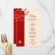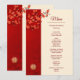 Des fleurs de cerisiers rouges et un double symbole de bonheur doré sur un arrière - plan rouge chatoyant. Avec des noms de mariée et de mariée personnalisés, la date du mariage et un texte de menu personnalisé. A l'arrière, on trouve un texte chinois traditionnel.