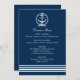 Le design moderne et preppy de la carte de menu du mariage nautique comprend un monogramme mariage affiché à l'intérieur d'une ancre de bateau avec des détails de corde nouée et de bande. Bleu marine, gris clair / argent, et blanc.