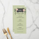 Ce menu de fleurs désertiques présente des fleurs roses et de la verdure de part et d'autre d'une boîte noire incurvée avec le mot "Menu". Tous les détails importants du menu mariage peuvent être modifiés. Les couleurs sont le vert, le rose, le blanc et le noir.