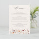 Améliorez votre expérience de repas mariage de automne grâce à nos menus Mariages Fleurs sauvages Boho Elegant. Imprimés avec grâce sur un arrière - plan crème charmant, ces menus 5x7 mettent en valeur l'allure enchanteresse des fleurs sauvages, donnant le ton parfait pour votre célébration élégamment d'inspiration bohème. Admirez les détails exquis et les couleurs chatoyantes de l'automne, car le design fleur sauvage ajoute une élégante touche de beauté naturelle à vos tables de réception. Avec la taille 5x7 qui offre un espace suffisant, vos sélections de menus délicieux sont élégamment affichées, assurant à vos invités un traitement culinaire qui s'harmonise avec l'amour de la saison. Conçu avec une attention méticuleuse aux détails et imprimé sur des matériaux de haute qualité, notre Elegant Boho Fleur sauvage Menus Mariage sert de garde-manger chéri à vos invités. Ajoutez une touche de charme fantaisiste et d'élégance à votre mariage de automne, et créez des souvenirs durables avec ces menus magnifiquement conçus, capturant la magie des fleurs sauvages et la joie de l'amour d'une manière élégante et raffinée.