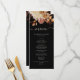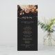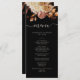 Cet élégant menu de mariage comprend des feuilles d'orange brûlée et de terre cuite peints à la main, des dahlias crème et beige, et de beaux roses de couleur rouille sur un arrière - plan noir. Trouvez les articles correspondants dans la collection Black Autumn Romance.