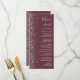 Le bord gauche de cet élégant menu mariage moderne présente un style de parties scintillant en faux argent. Le texte personnalisable combine écriture gris argenté, copperplate et polices italiques sur un arrière - plan bordeaux. L'envers présente une parties scintillant bordeaux et argentée assortie.