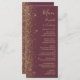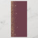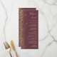 Le bord gauche de cet élégant menu mariage moderne présente un style de parties scintillant en faux or. Le texte personnalisable combine écriture manuscrite couleur or pâle, cuivre et polices italiques sur un arrière - plan bordeaux foncé. L'envers est assorti d'une parties scintillant bordeaux et dorée.