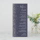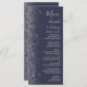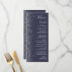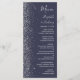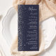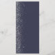 Le bord gauche de cet élégant menu mariage moderne présente un style de parties scintillant en faux argent. Le texte personnalisable combine écriture gris argenté, copperplate et polices italiques sur un arrière - plan bleu marine foncé. L'envers présente un design de parties scintillant bleu foncé et argent assorti.