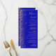 Le bord gauche de cet élégant menu mariage moderne présente un style de parties scintillant en faux or. Le texte personnalisable combine écriture manuscrite couleur or pâle, cuivre et polices italiques sur un arrière - plan bleu royal. L'envers affiche une parties scintillant bleu royal et or assortie.