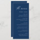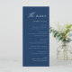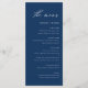 Ajoutez un accent élégant à votre paysage de table d'événements avec cette carte de menu personnalisable. Il présente un script fantaisiste et une typographie simple. Personnalisez cette carte de menu moderne en ajoutant vos propres détails. Cette carte marine bleue et blanche est parfaite pour les mariages, les douches nuptiales, les baby showers et bien plus encore.