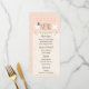 Une carte de menu mariage à thème inséparable avec deux colombes blanches, l'une portant le chapeau d'un marié gris et l'autre portant un voile de mariée fleuri. Ajoutez vos éléments de menu à l'arrière - plan parchemin. Le dos de la carte a un design de coeur à pois. Des fleurs blanches sur des branches d'arbres, des coeurs coralliens, des fleurs roses et brunes et une couronne de laurier à la menthe et à la tulipe rose se trouvent sur une bordure en ROSE ROSE ROSE PALE CORAL. Oeuvre © Chrissy H. Studios, LLC. Tous droits réservés.