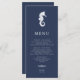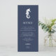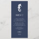 Cette élégante suite de mariage présente un style nautique classique et un style épuré et minimaliste. Des vagues stylistiques dans les teintes de l'aqua au bleu marine et une belle illustration d'hippocampe apportent des accents uniques. Une petite image d'hippocampe en blanc sur bleu marine, ainsi qu'un modèle fourni pour ajouter vos sélections de menu, vos initiales et la date du mariage. Idéal pour les mariages de club nautique, de bateau, de plage ou d'été. Recherchez ID836 pour voir cette suite complète et d'autres qui offrent des accents d'éléments marins alternatifs.