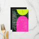 Arcs rose néon et jaune sur arrière - plan en feuilles de palmier foncé. Monogramme vertical au-dessus de l'arc jaune. Texte blanc sur arche rose avec feuille d'art en ligne blanche à gauche.
