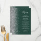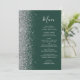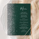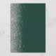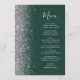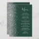 Le bord gauche de cet élégant menu mariage moderne présente une bordure de parties scintillant en faux argent. Le texte personnalisable combine un script d'écriture blanc gris argenté et des polices de cuivre sur un arrière - plan vert émeraude foncé. L'envers présente une parties scintillant verte et argentée assortie.