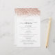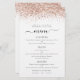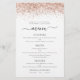 Menu Mariage Rose Élégant pour la Parties scintillant d'or. Un prix économique de 5,5" x 8,5", sur un élégant stock LINEN de 110 lb - pour une sensation de luxe à un bon rapport qualité-prix, il est parfait pour les menus, ainsi que des invitations et des programmes, etc. Cette alternative de taille budgétaire est également disponible dans d'autres choix de papier. Le stock de carte SEMI-GLOSS 110 lb est à peu près de la même épaisseur qu'une carte postale, donc fonctionne bien aussi pour les invitations. Le papier FELT 100 lbs est de couleur bouffante, PAS blanc, donc ajoute une touche rustique. Le stock de papier MATTE 80lbs est blanc vif, pour une impression nette, idéal pour vos menus et programmes, tandis que le papier SATIN 80lbs est mince et léger, idéal pour les enceintes. Un script élégant avec des swashes pour l'en-tête Menu et une fausse bordure de parties scintillant en or rose en haut sur les deux côtés. Personnalisez facilement le reste du texte à vos propres détails qui inclut des alternatives pour vos options végétaliennes ou végétariennes.