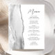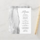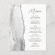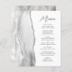 Le bord gauche de cet élégant menu mariage moderne présente une aquarelle grise ornée d'une parties scintillant en faux argent. Le texte personnalisable combine le script d'écriture manuscrite gris charbon et les polices sans serif sur un arrière - plan blanc. Le design de l'agate gris et argent est répété à l'envers.