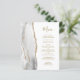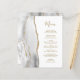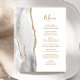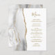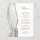 Le bord gauche de cet élégant menu mariage moderne comporte une bordure d'aquarelle gris et blanc ornée d'une parties scintillant en faux or. Le texte personnalisable combine un script d'écriture manuscrite de couleur or fantaisie et des polices de cuivre sur un arrière - plan blanc. L'envers présente un design d'agate gris et or assorti.