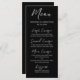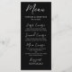 Ce menu de mariage personnalisé moderne présente un design de script en lettres blanches sur un simple arrière - plan noir. Personnalisez avec vos noms et votre date de mariage ainsi que vos choix de repas. Meilleurs voeux pour votre mariage et mariage ! Conçu par Susan Coffey.