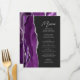 Cet élégant menu mariage moderne comprend une bordure d'aquarelle violette ornée d'une parties scintillant en faux argent. Le texte personnalisable combine écriture manuscrite gris argent et polices sans serif sur un arrière - plan noir ardoise. Le design d'agate violet et argenté est répété à l'envers.
