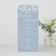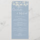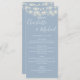 Elégante carte de menu mariage bleu poussiéreux avec de jolies lampes à cordes et des noms de style signature. Cette carte de menu moderne peut être personnalisée avec vos informations en lettres blanches chic. Conçu par Thisisnotme©