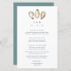 Partagez les détails de votre menu de réception de mariage dans un style élégant avec ces menus mariages côtiers en blanc avec du lettrage marine et un trio d'illustrations aqua et ivoire en coquille d'huîtres aquarelle. Ajoutez vos initiales et la date du mariage en haut, puis customisez les éléments du menu disposés par le cours.