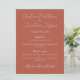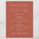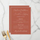 Ce menu de mariage ou d'événement moderne et élégant présente un fond en terre cuite. Les noms des mariés sont imprimés dans une police script. Vous pouvez personnaliser les éléments du menu avec vos propres options culinaires.