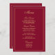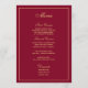 Un menu mariage élégant pour vous permettre de personnaliser. Sur un arrière - plan bordeaux avec écriture or. Une combinaison d'une police de script élégante et de polices modernes faciles à lire. Un grand espace a été alloué pour les options de menu. Le verso de la carte a des pois d'or pointé fin. Besoin d'aide pour personnaliser ? Contactez le concepteur.