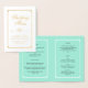 Menu plié mariage en or, blanc et vert menthe. La couverture du menu est blanche avec des détails en feuille d'or, un cadre simple et des polices élégantes. Ajoutez votre menu mariage à l'intérieur en texte noir contre un arrière - plan vert menthe. Au verso, vous pouvez écrire une note de remerciement à vos invités mariages en feuille d'or.