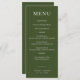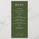 Menu de mariage élégant Olive Green moderne avec script blanc. Personnalisez-le avec vos informations. Affichez la collection correspondante.